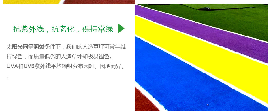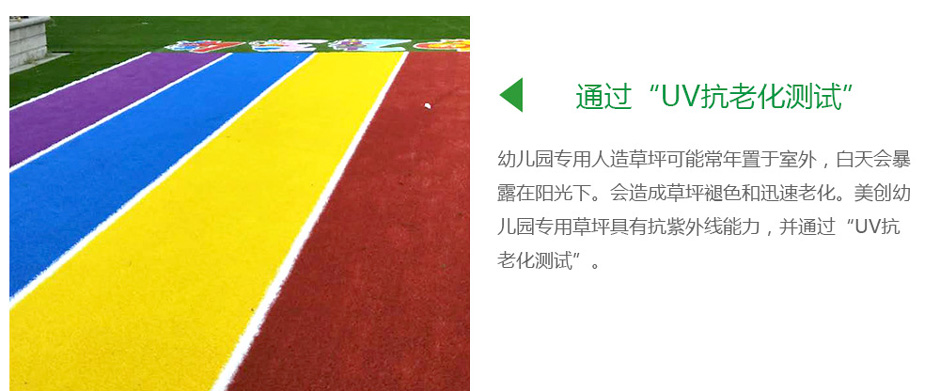 幼儿园专用人造草坪可能常年置于室外,白天会暴露在阳光下。而阳光中的UVA和UVB紫外线是人造草坪的杀手,会造成草坪褪色和迅速老化。就像在阳光下我们的皮肤需要保护一样,人造草坪也需要超强的抗紫外线能力才能保持常绿。美创幼儿园专用草坪具有抗紫外线能力,并通过“UV抗老化测试”。太阳光同等照射条件下,我们的人造草坪可常年维持绿色,而质量低劣的人造草坪却极易褪色。UVA和UVB紫外线平均辐射分布因时、因地而异。日照较少的地区紫外线辐射较弱,热带和高原地区紫外线辐射较强。